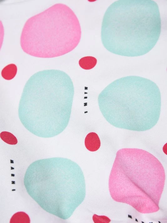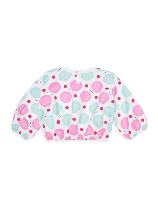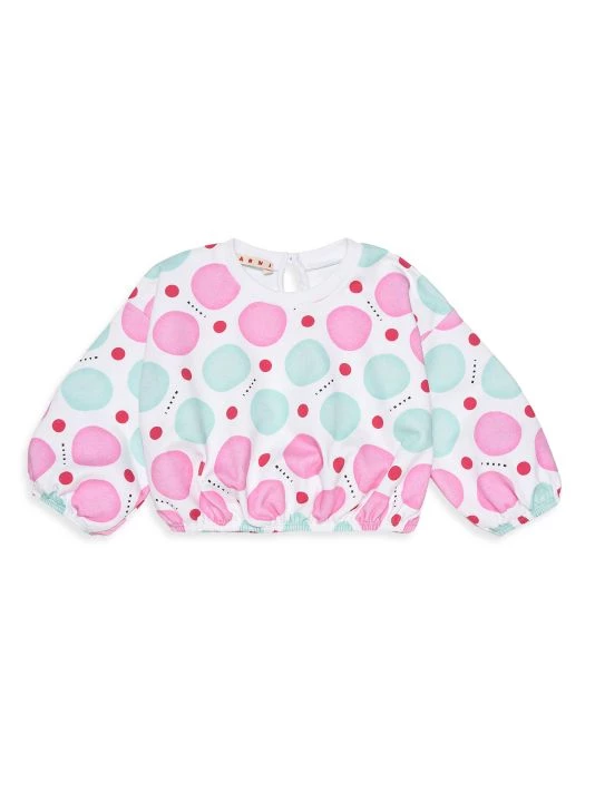 This fleece crewneck sweatshirt in a drop-shoulder silhouette showcases a multicolor dot pattern, long puff sleeves, and an elasticated hem.