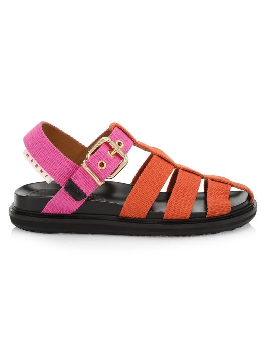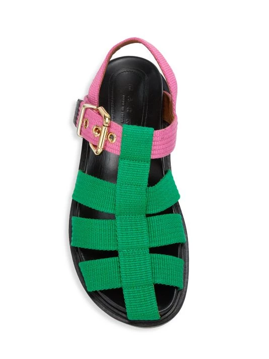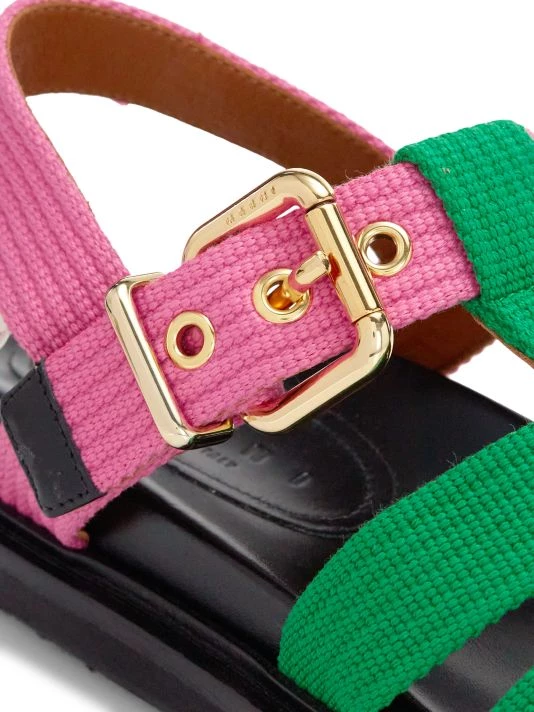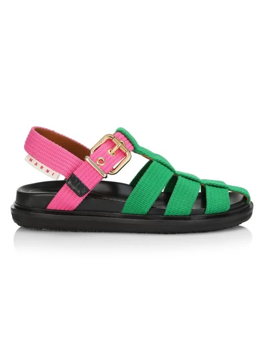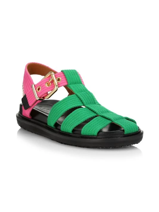 Marni’s fisherman sandals feature a green and pink cotton upper.