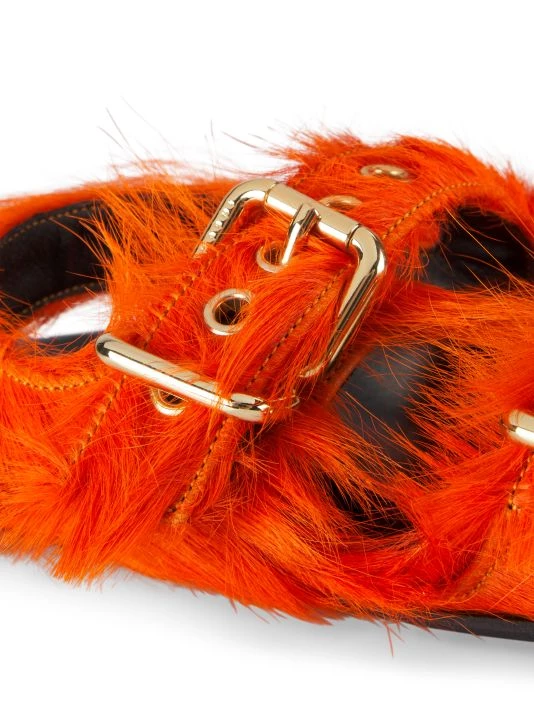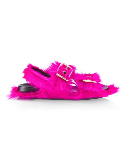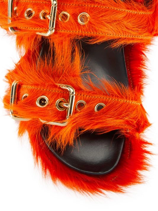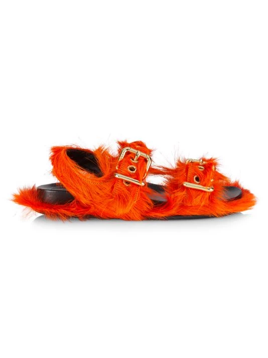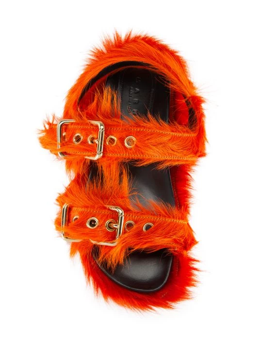 Fastened with gleaming logo-engraved double buckle straps, Marni’s Fussbett sandals are crafted of long-haired calf fur.