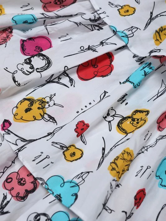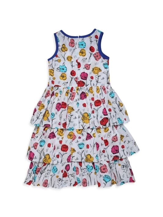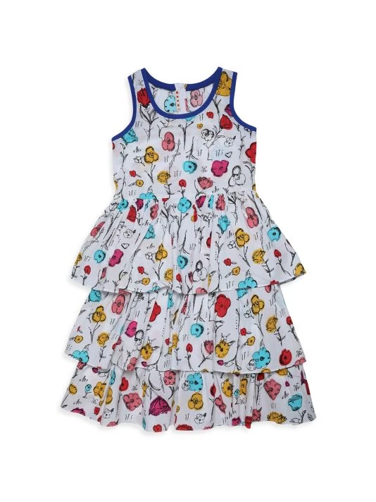 Styled with a tiered ruffle skirt and solid trim, this dress features a whimsical multi-floral print.