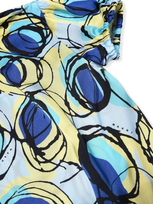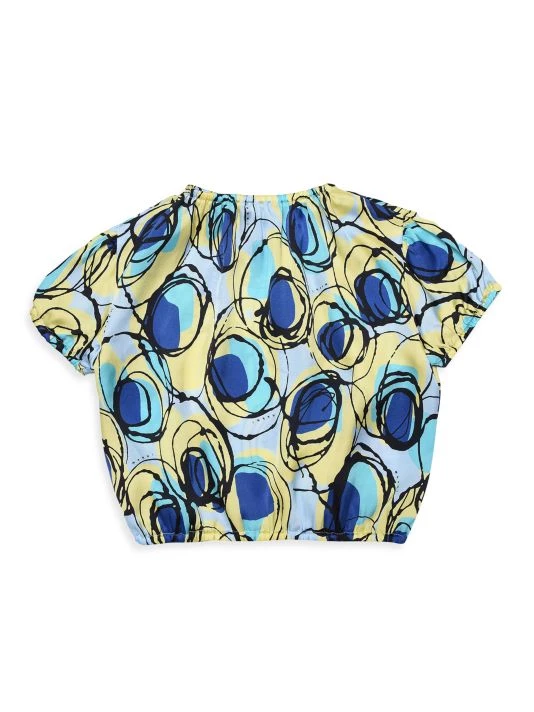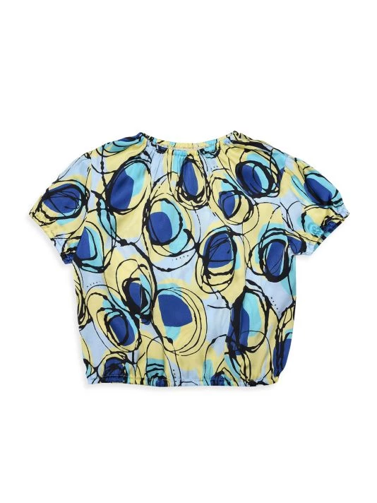 This blouson top in a vibrant abstract print features short puff sleeves.