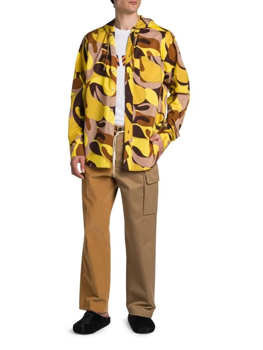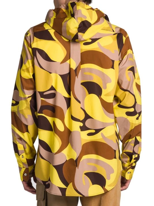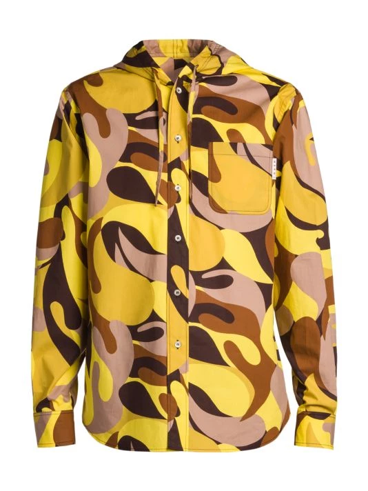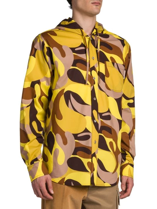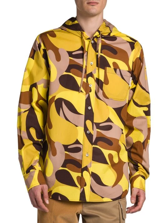 This hooded shirt features a mother of pearl buttons and a chest patch pocket.