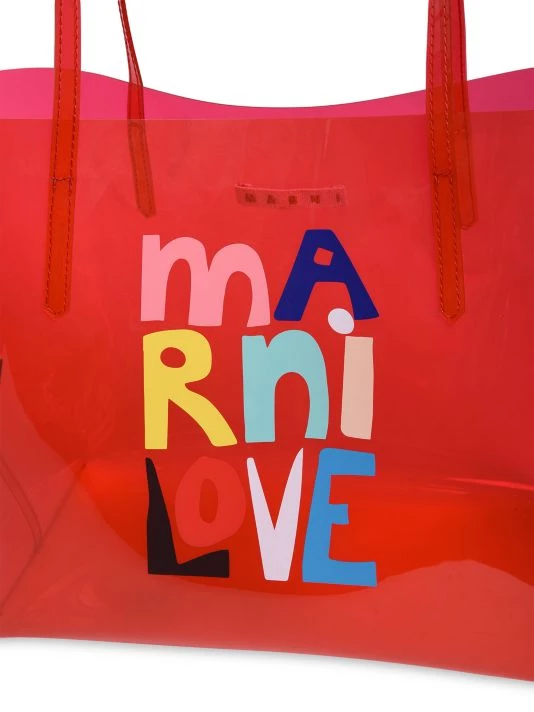 A bold graphic logo adorns the front of this glossy vinyl tote bag.