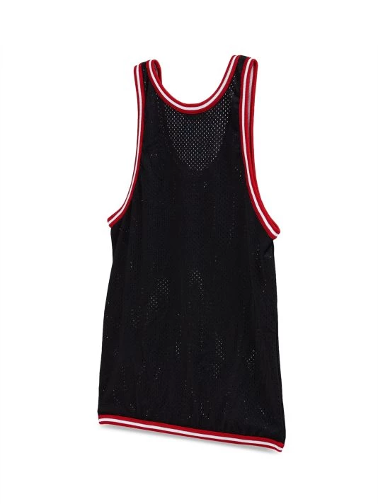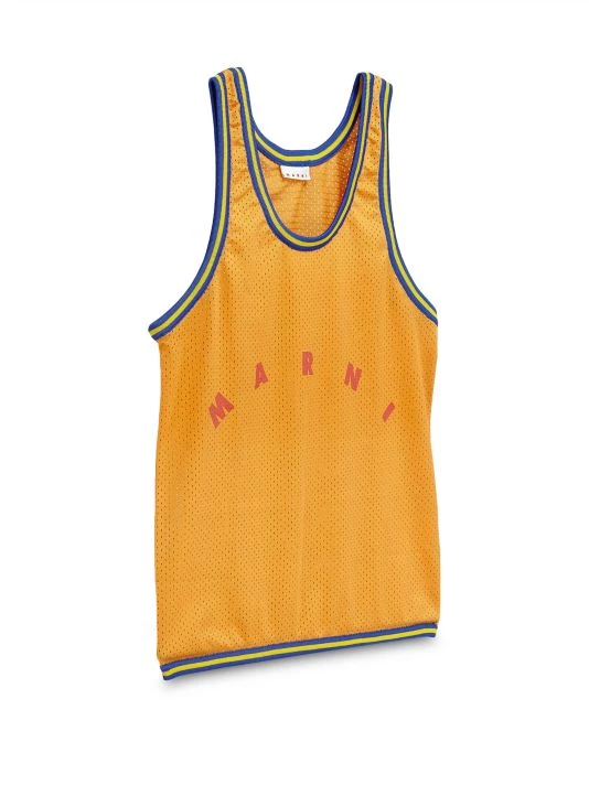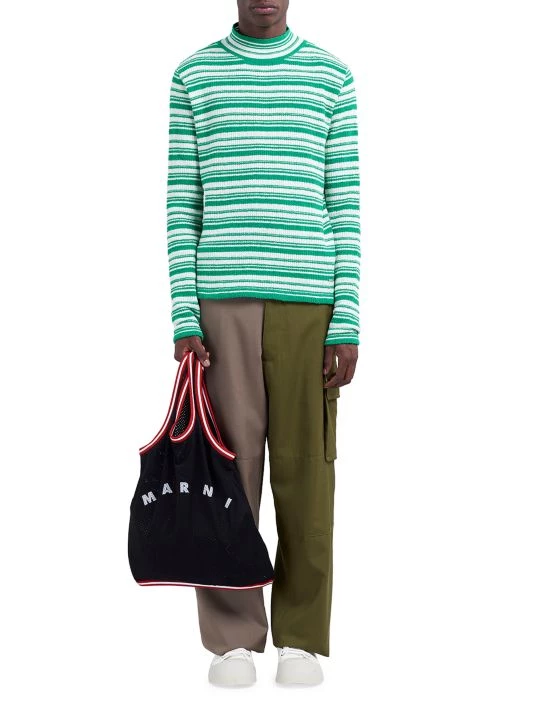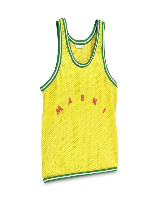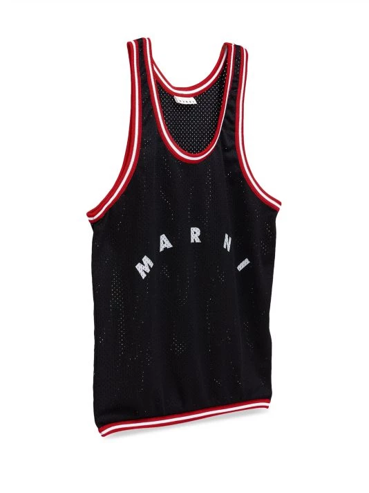 This shopping bag features a tank top-inspired silhouette with striped knitted trim and a printed Marni logo.