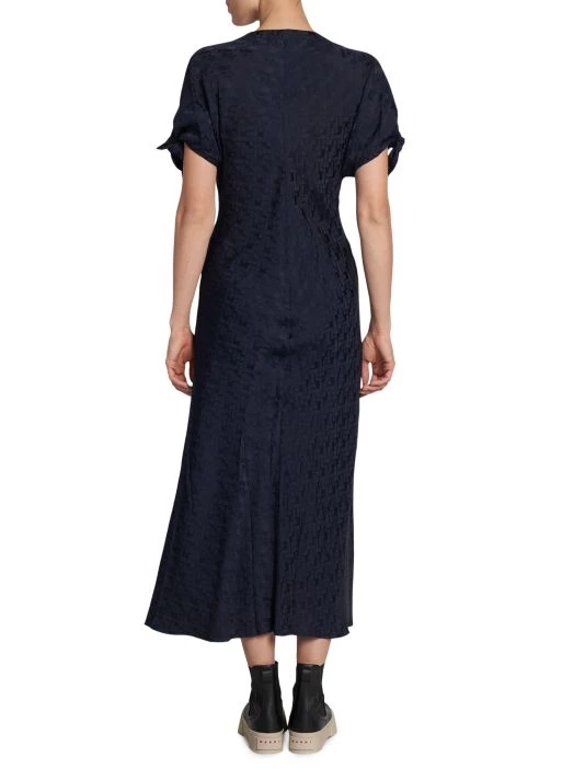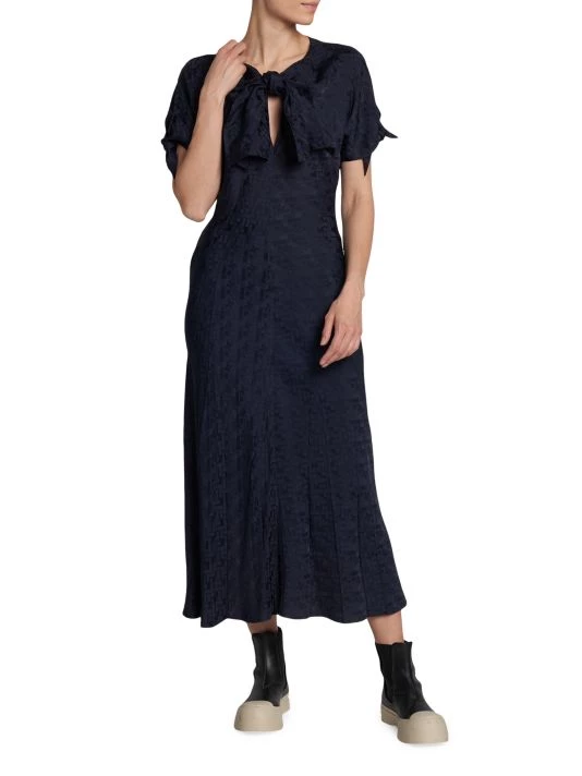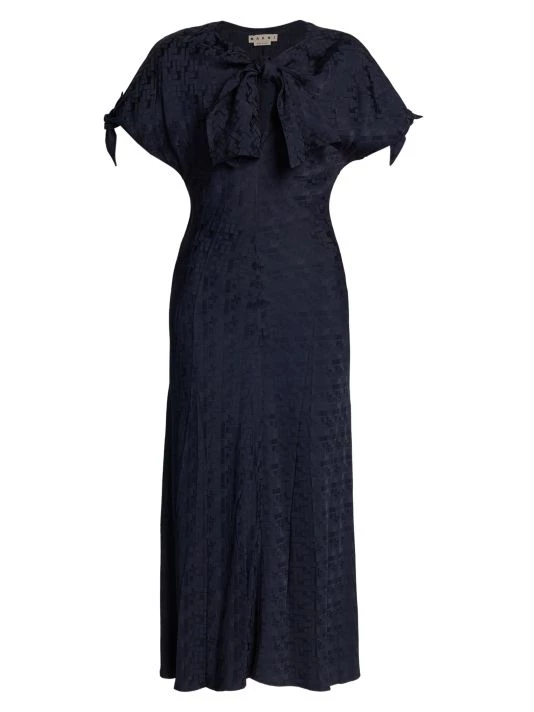 Marni’s midi-dress is cut with an A-line silhouette and features a pleated skirt. Tie details at the neck and short sleeves add an ultra-feminine flair to this sophisticated style.