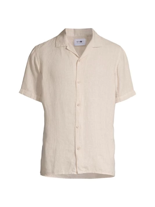From the High Summer Collection. This short-sleeved bowling shirt is crafted of garment-dyed linen and finished with tonal acrylic buttons.