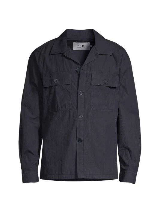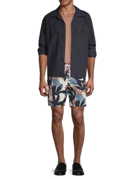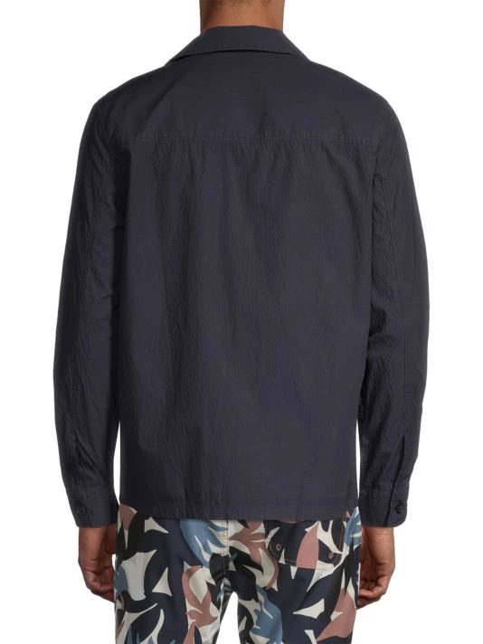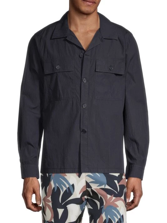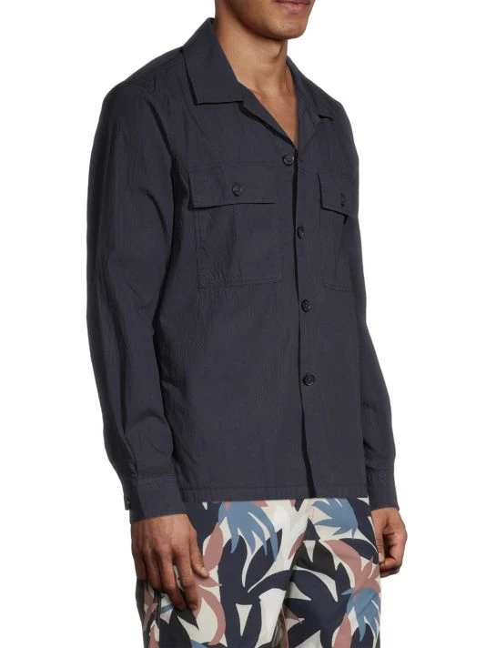 From the High Summer Collection. Crafted of lightweight stretch cotton, this shirt-jacket hybrid is constructed with a chest cutline and twin flap pockets.